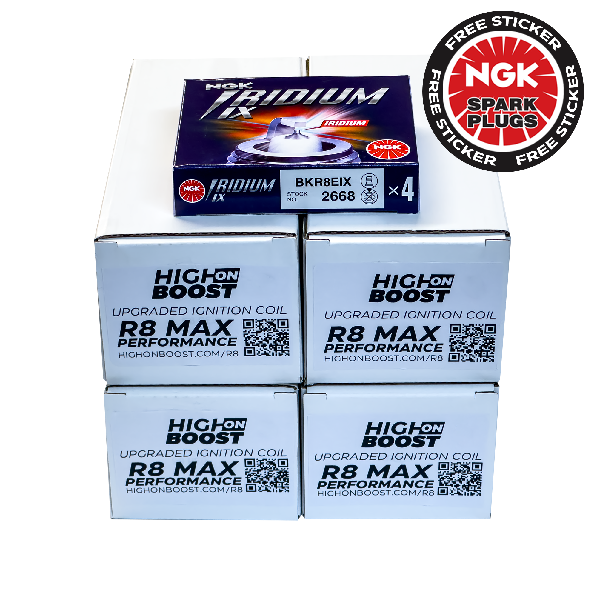 NGK x High on Boost – 2.0 TSI EA113 / EA888 (Gen 1/2) “R8” High-Performance Ignition Bundle Includes NGK BKR8EIX (2668) Colder Heat Range Spark Plugs + R8-Style Coil Packs + V2 Thermal Heat-Sinks Unleash consistent spark delivery, detonation resistance, and boosted reliability with this performan...